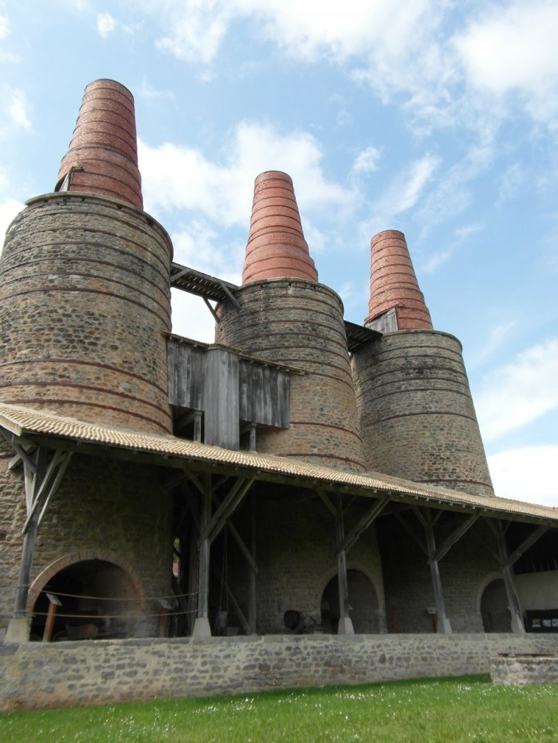 Historique : Identiques aux fours de Montluçon et de Bourg en Bresse (aujourd’hui démolis), les fours doivent leur existence à la construction de la ligne de chemin de fer d’intérêt local reliant Moulins à Mâcon et à la présence d’une matière première (roche calcaire) de bonne qualité et exploitable. Remarquables par leurs cheminées de 7 mètres de hauteur, ce sont les derniers fours recensés en France surmontés de cheminées en brique. Construits par la famille Mangini, lyonnais d’origine italienne, ils ont été ensuite revendus à M. Duverne en 1888 avant d’entrer dans la famille Merle dans les années 1930. Les fours étaient alimentés en charbon et en pierres depuis les passerelles toujours visibles. La partie four mesurait 15m de haut.